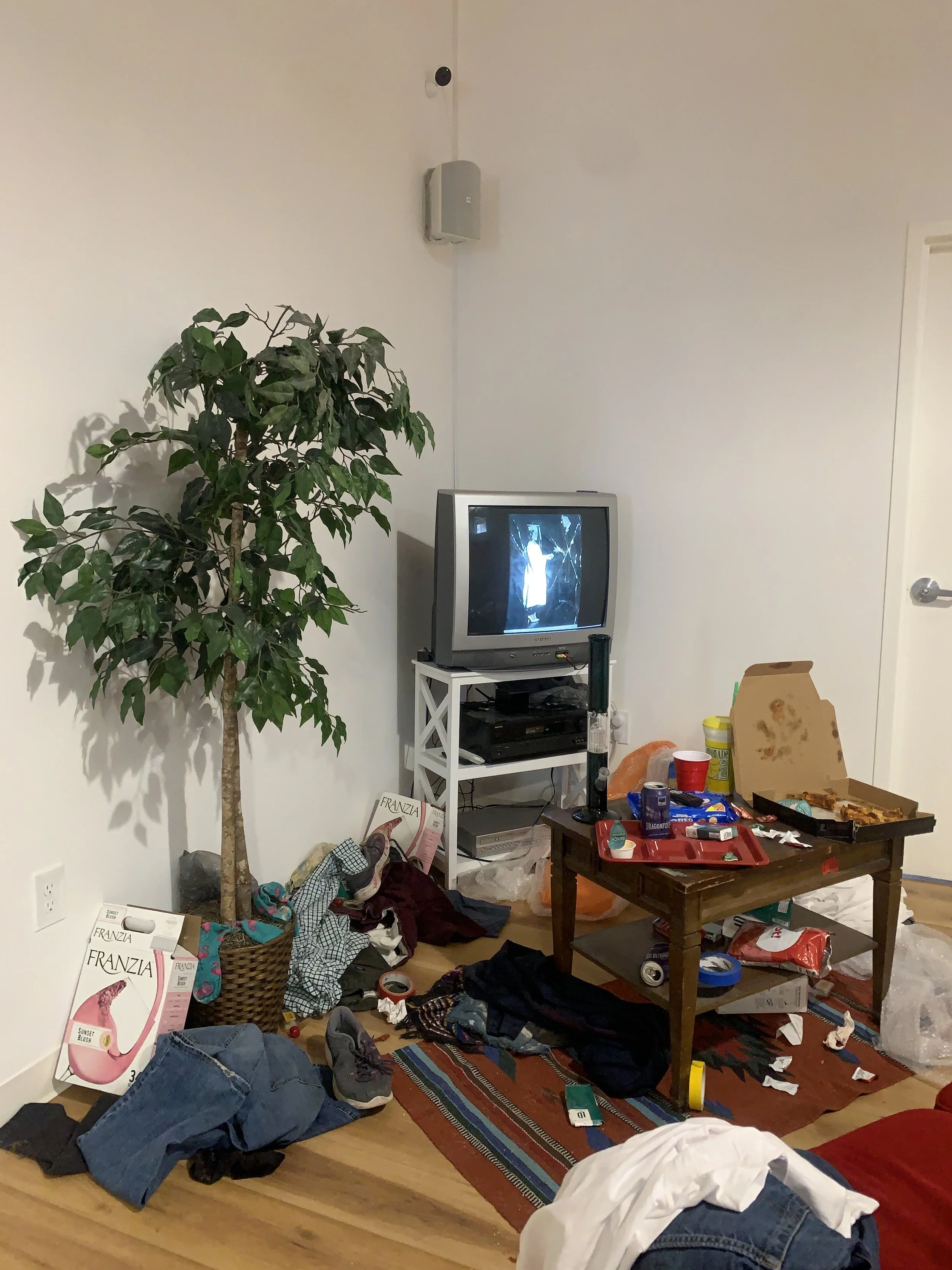 Empty Boxes of Franzia (White Zin preferred), Empty Shot Bottles, Fake Plant, Vintage Couch, Thrifted Rug, Borrowed Tables, Dresser from Childhood, a Bong, Various Rolls of Tape, Articles of Clothing, Empty Beer Cans, Empty Packs of Cigarettes, Tube TV, VHS Player with VHS, Vintage School Lunch Tray, Solo Cups, and Shipping Materials